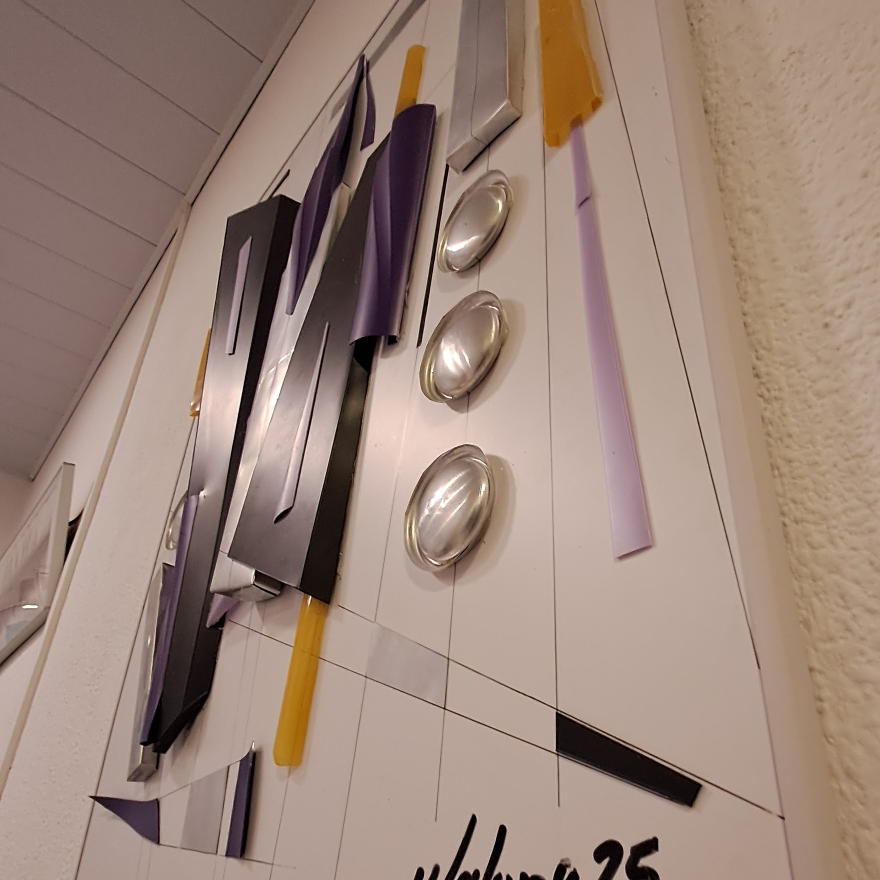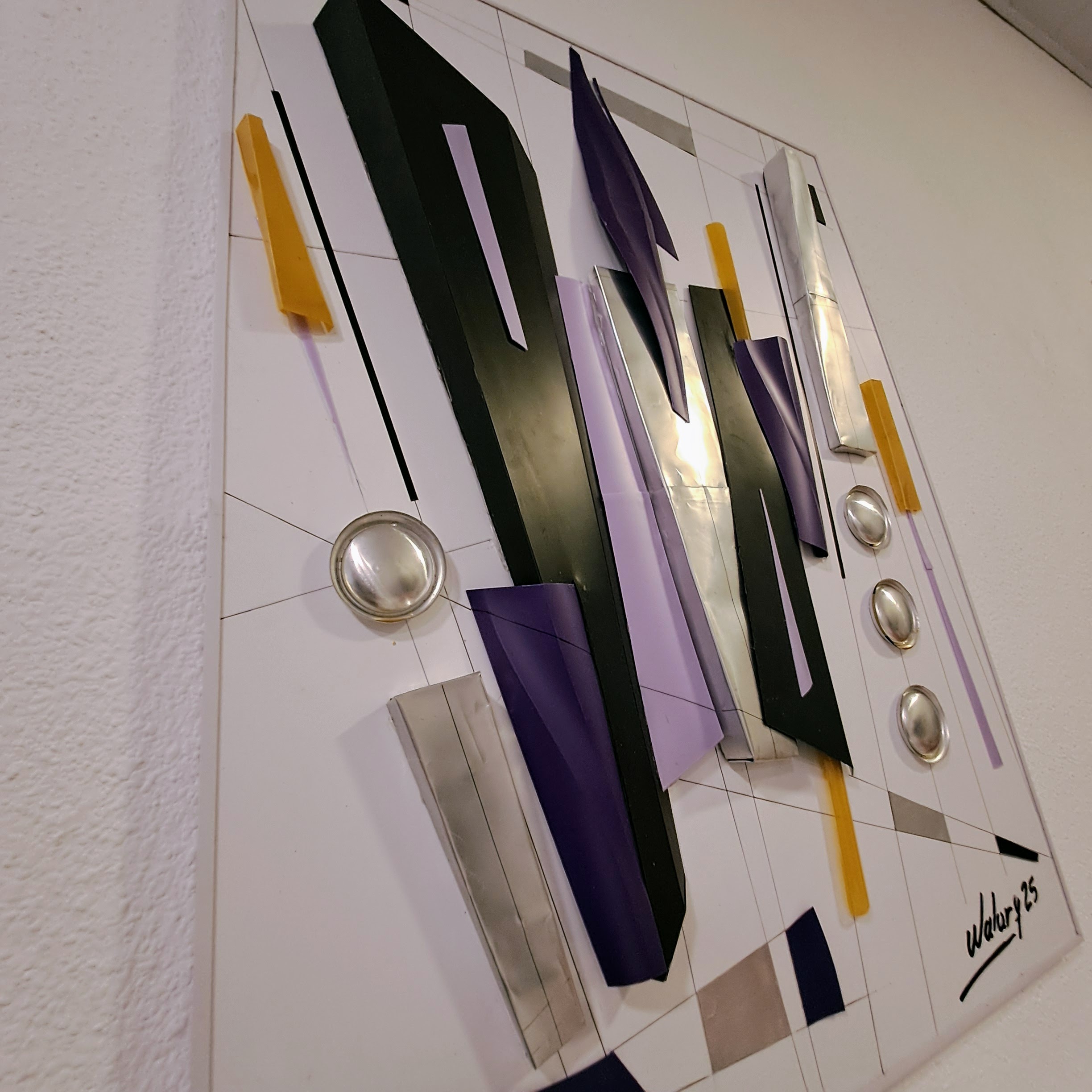 Evoca la idea de un amanecer que no se expande horizontalmente como en la naturaleza, sino que asciende, concentrado en líneas y estructuras, como si la luz misma se adaptara a un lenguaje arquitectónico y sintético. Además, dialoga con el contraste entre lo orgánico (aurora) y lo artificial (formas, materiales reciclados)..