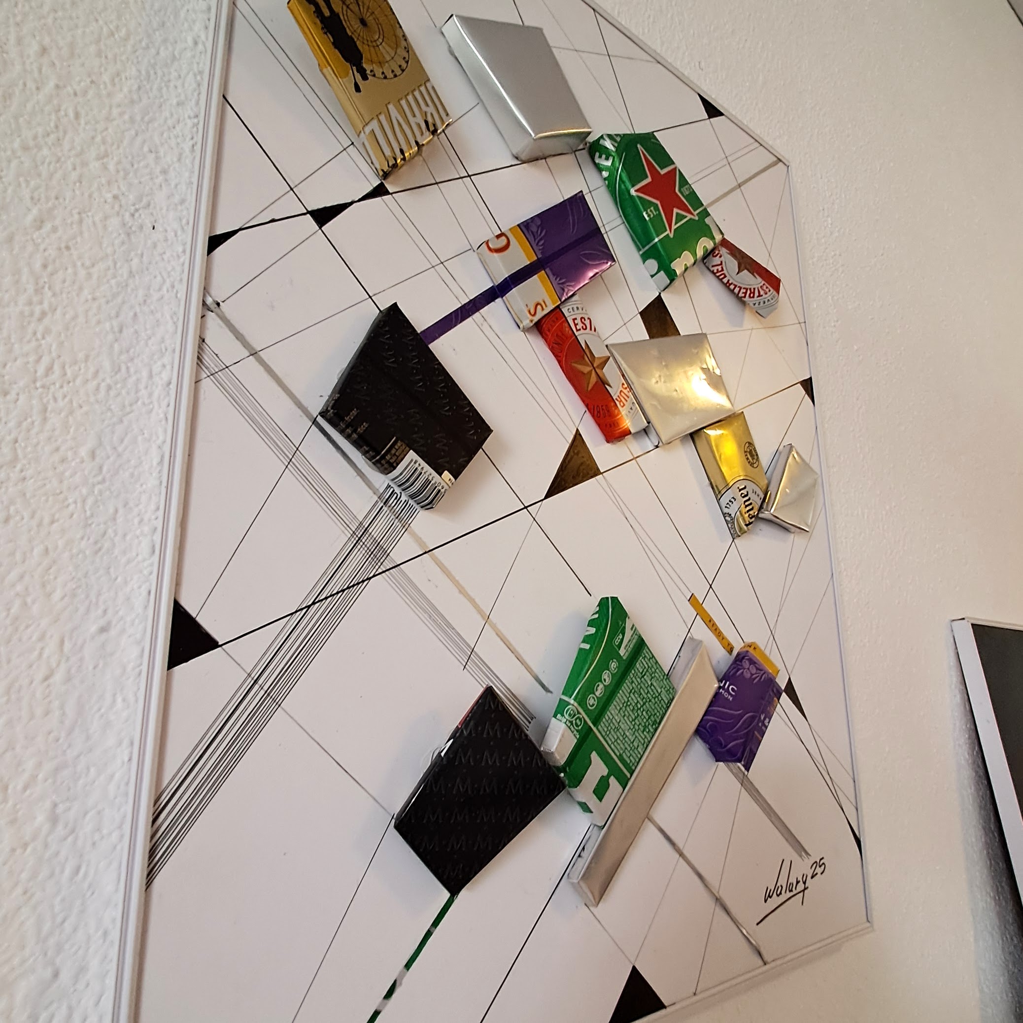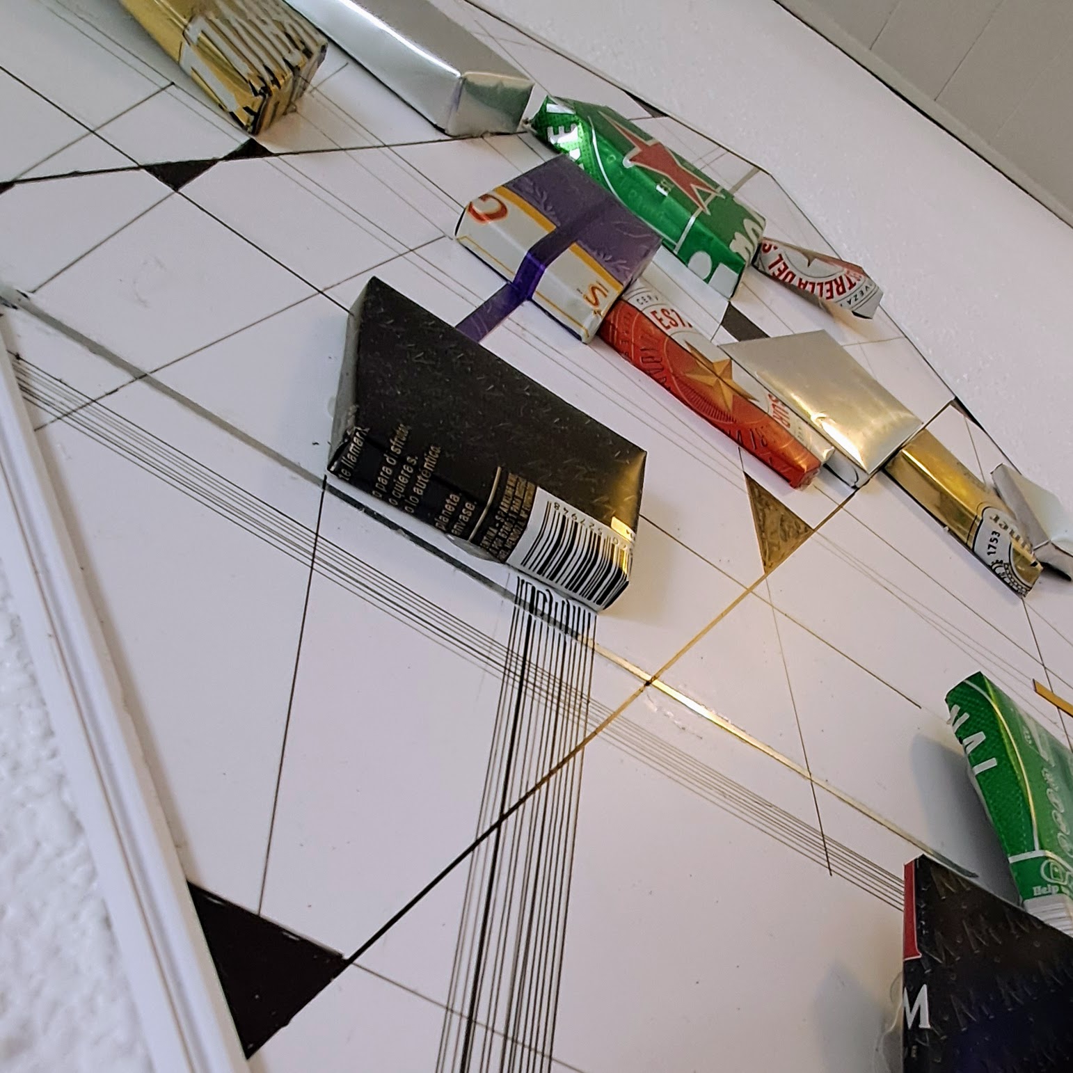 Los fragmentos de envases y envoltorios, restos de una marea cotidiana, se reconfiguran en una trama de líneas y tensiones. Lo descartado se convierte en signo, en coordenada de un mapa que revela los desplazamientos del deseo y la huella del consumo.