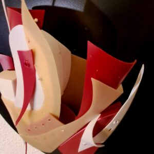 Las curvas y transparencias insinúan un pulso orgánico, pero su materia revela lo opuesto: una coreografía hecha de residuos, de brillos industriales que alguna vez prometieron perfección.