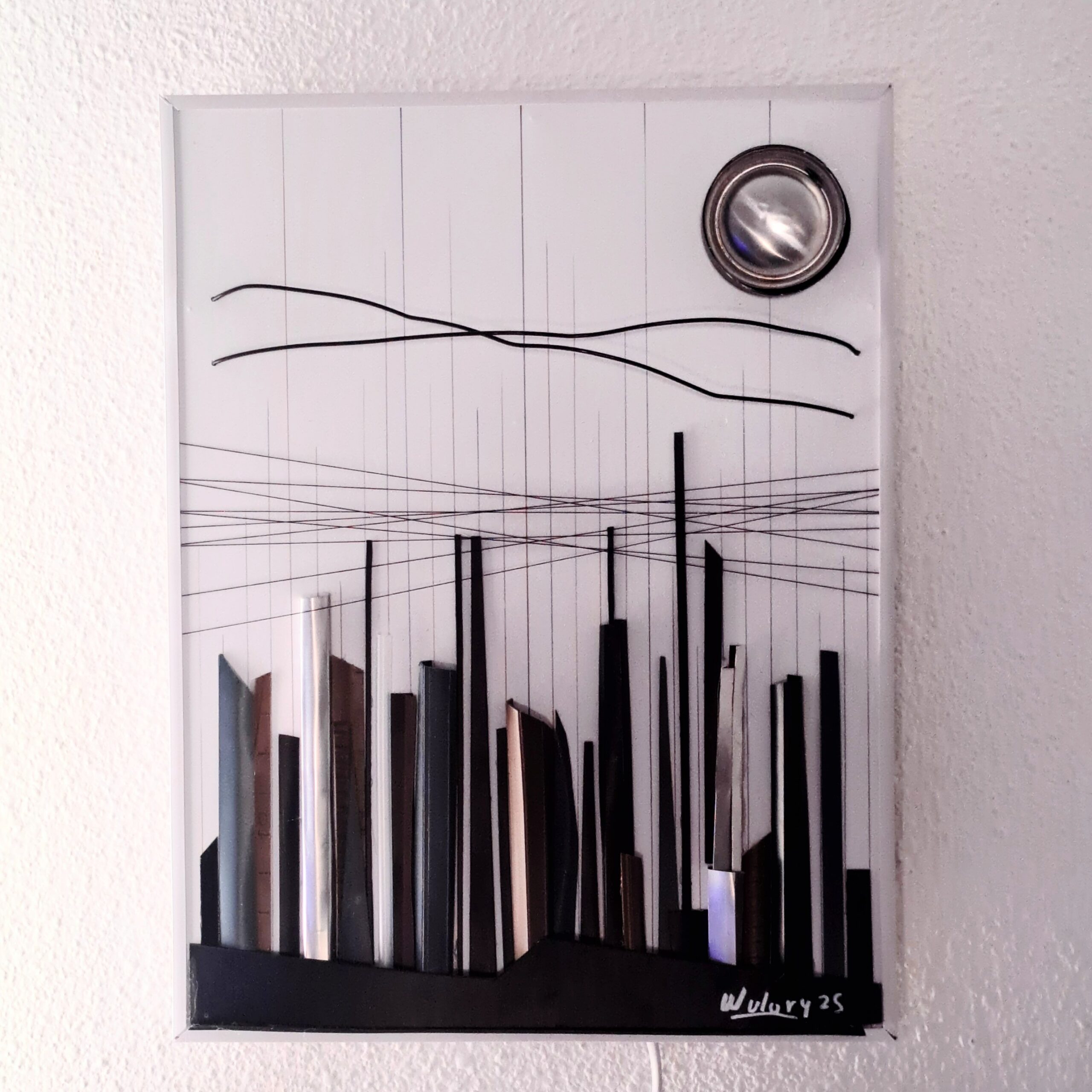 Cada línea, cada plano, se convierte en estrato de tiempo, en vestigio que asciende hacia un horizonte artificial.
