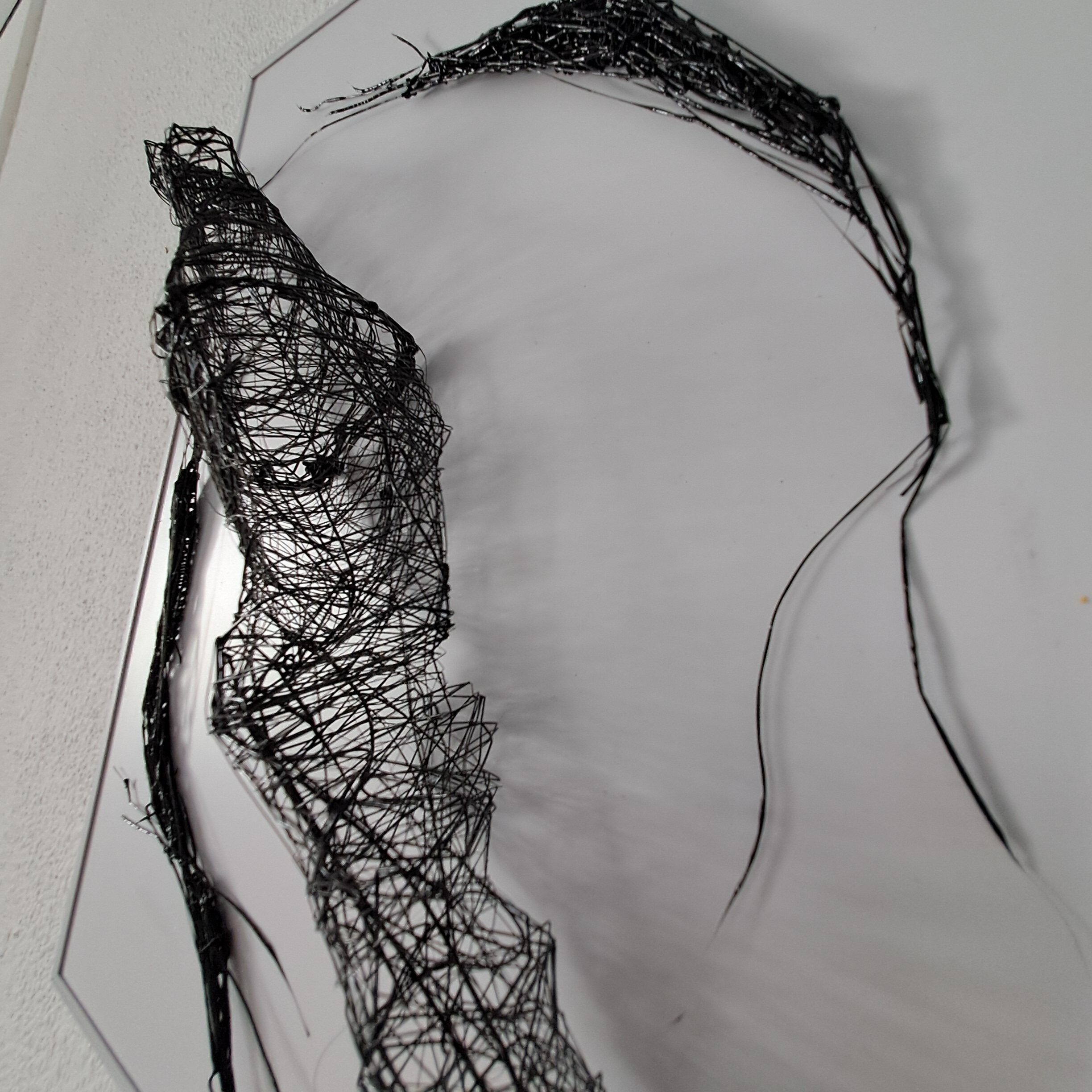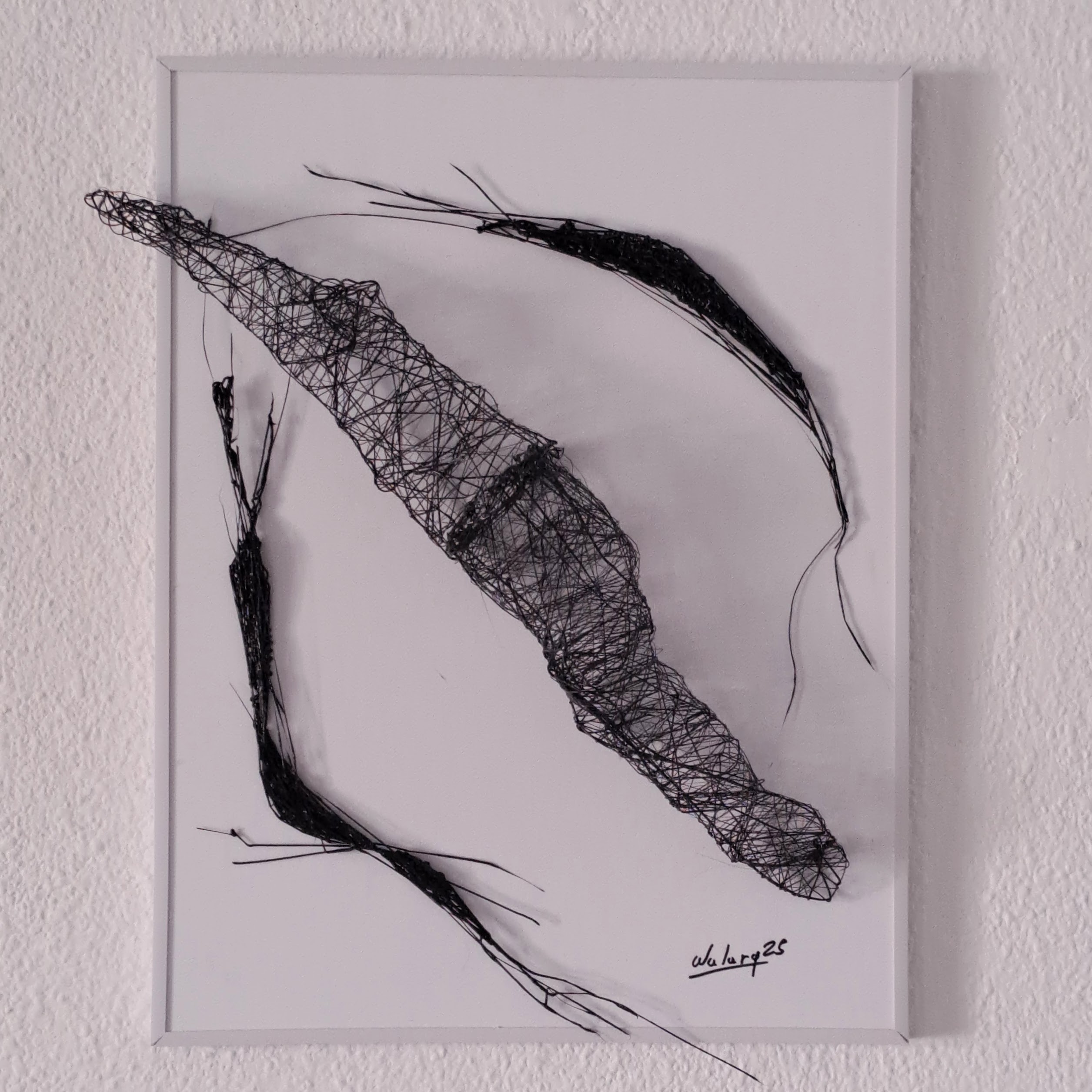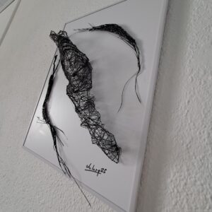 La obra evoca la muda de un ser alado que ha dejado atrás su envoltura. Esa piel frágil, casi transparente, ya no pertenece al cuerpo, pero conserva la memoria de su forma. Suspendida en el espacio, se vuelve metáfora del vacío habitado: un resto delicado que sugiere vuelo, transformación y ausencia.