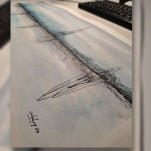 Las líneas oscilantes parecen registrar un pulso invisible, como si el río susurrara su propia partitura. El fluir del agua se convierte en melodía, y cada cresta y valle son acordes que viajan, llevando historias de orillas lejanas.