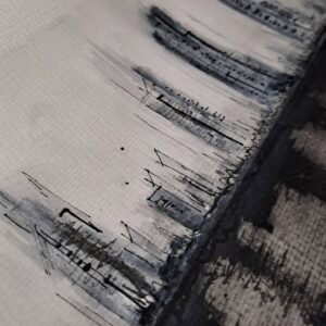 En esta obra, la ciudad se convierte en una partitura visual donde el horizonte urbano vibra como un eco sonoro. El reflejo en el agua no es mera simetría, sino una metáfora de la resonancia interior de la urbe: fragmentada, ambigua, en constante tensión. A través de líneas desdibujadas y estructuras distorsionadas, “Skyline Sound” deconstruye la idea de ciudad como forma sólida, proponiéndola como un cuerpo en movimiento, una arquitectura que se escucha tanto como se observa.