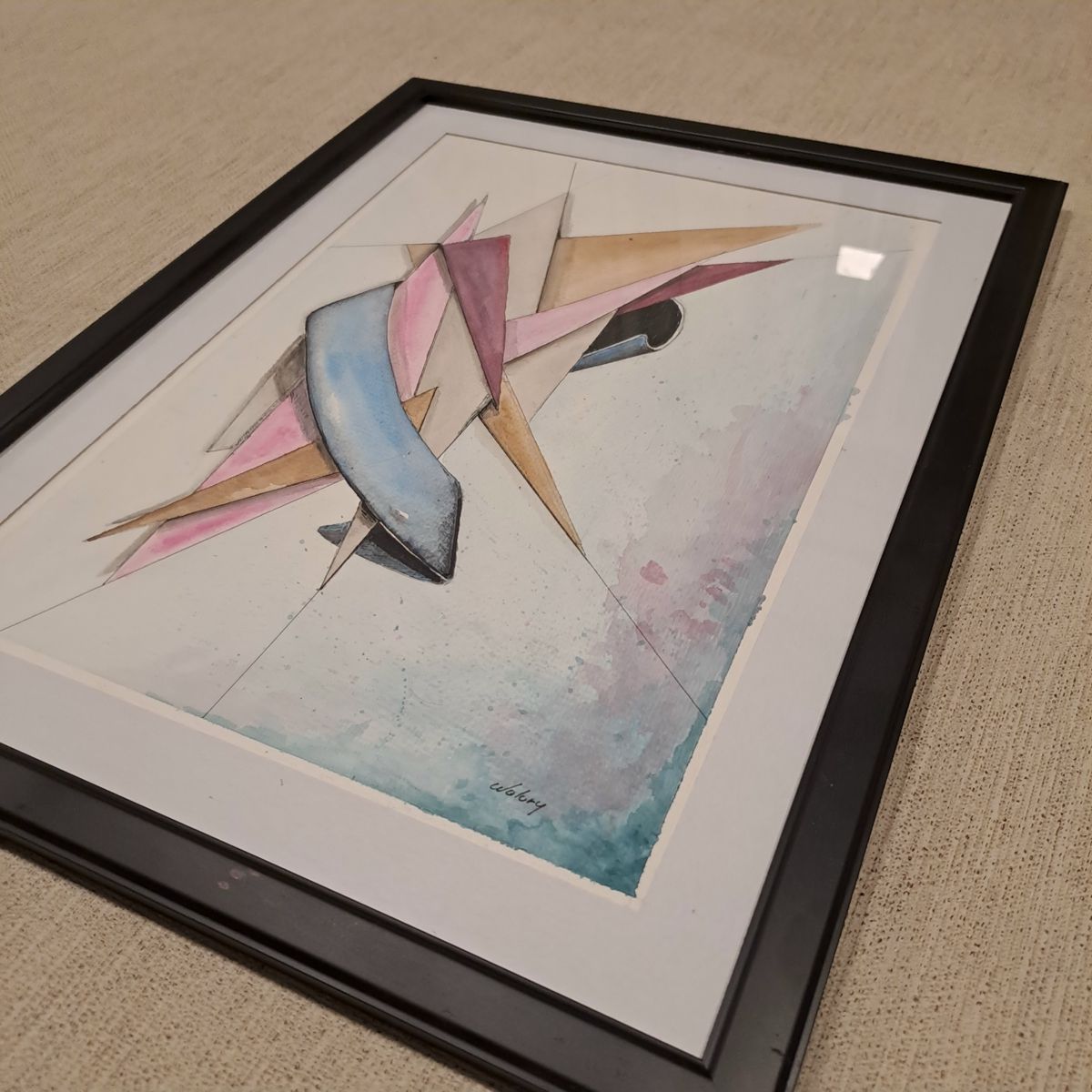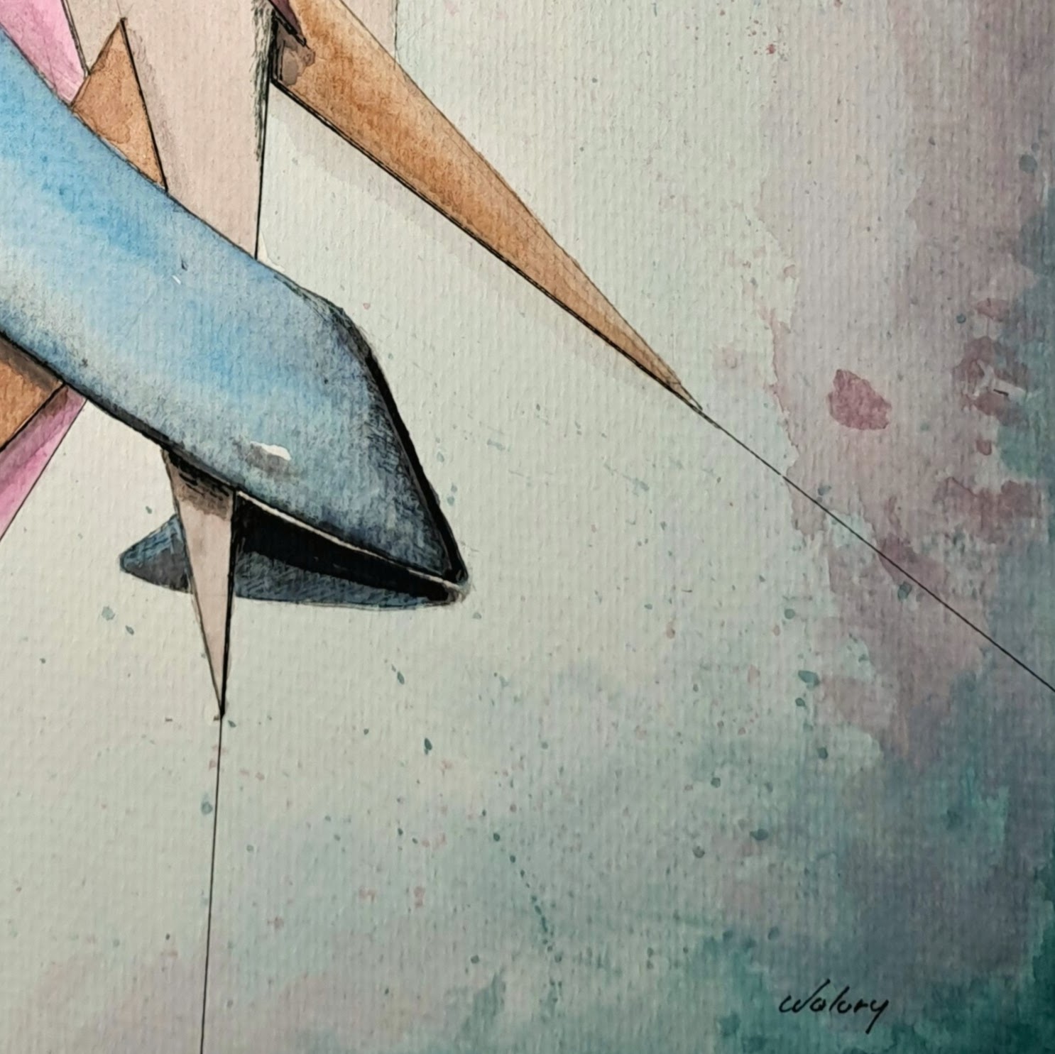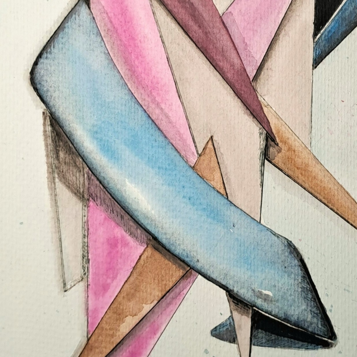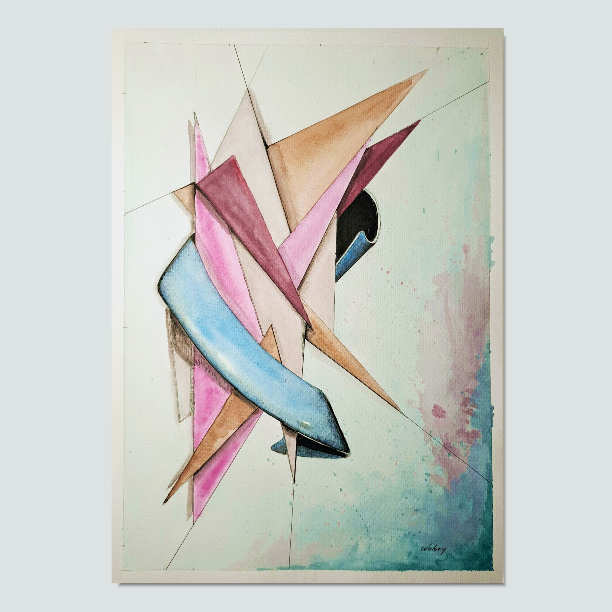 La composición fragmentada, aguda y fluida a la vez, nos envuelve en una coreografía silenciosa de planos superpuestos y direcciones cruzadas. Aquí, las formas se deslizan unas sobre otras, como si buscaran el roce, el cruce mínimo, ese punto de fricción donde nace el sentido. En “Susurro envolvente”, la geometría no grita: murmura