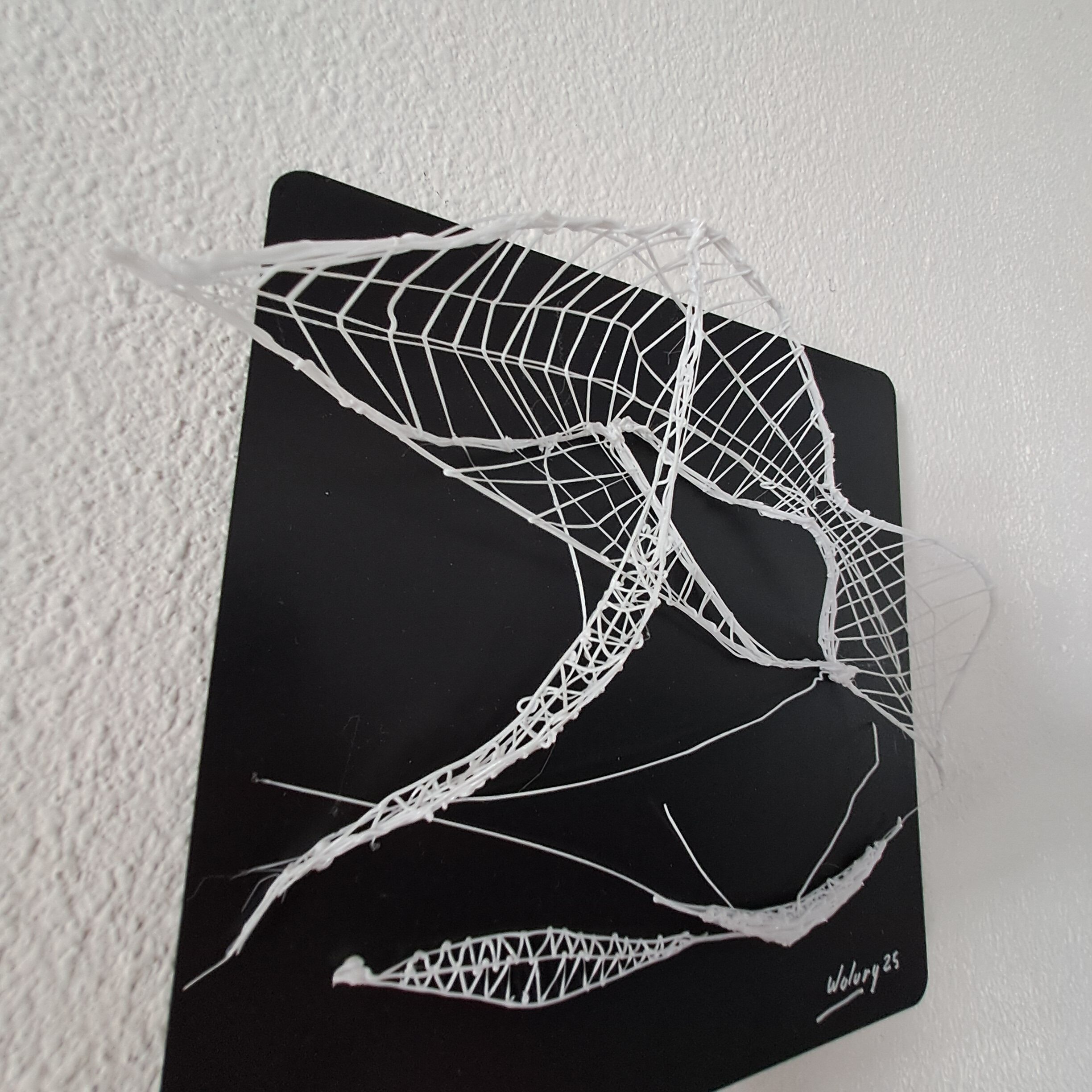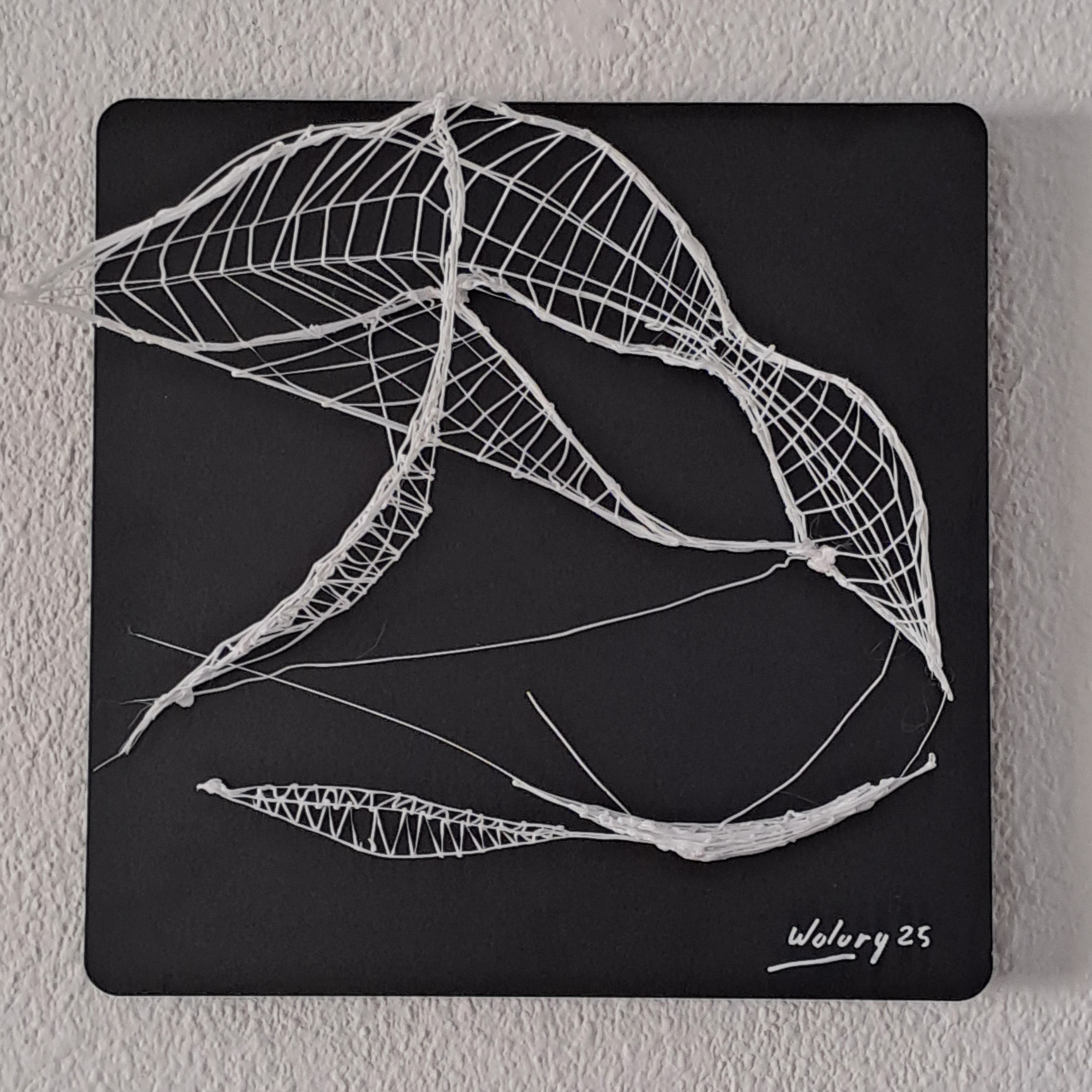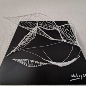 La línea se emancipa del plano y adquiere cuerpo, aire y tensión. El hilo dibuja una arquitectura efímera: una red que parece sostener el vacío más que llenarlo.