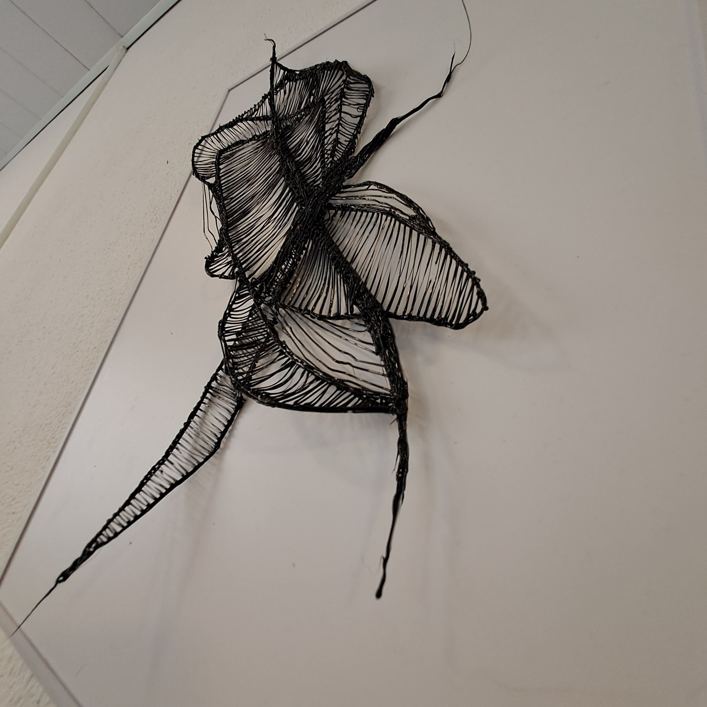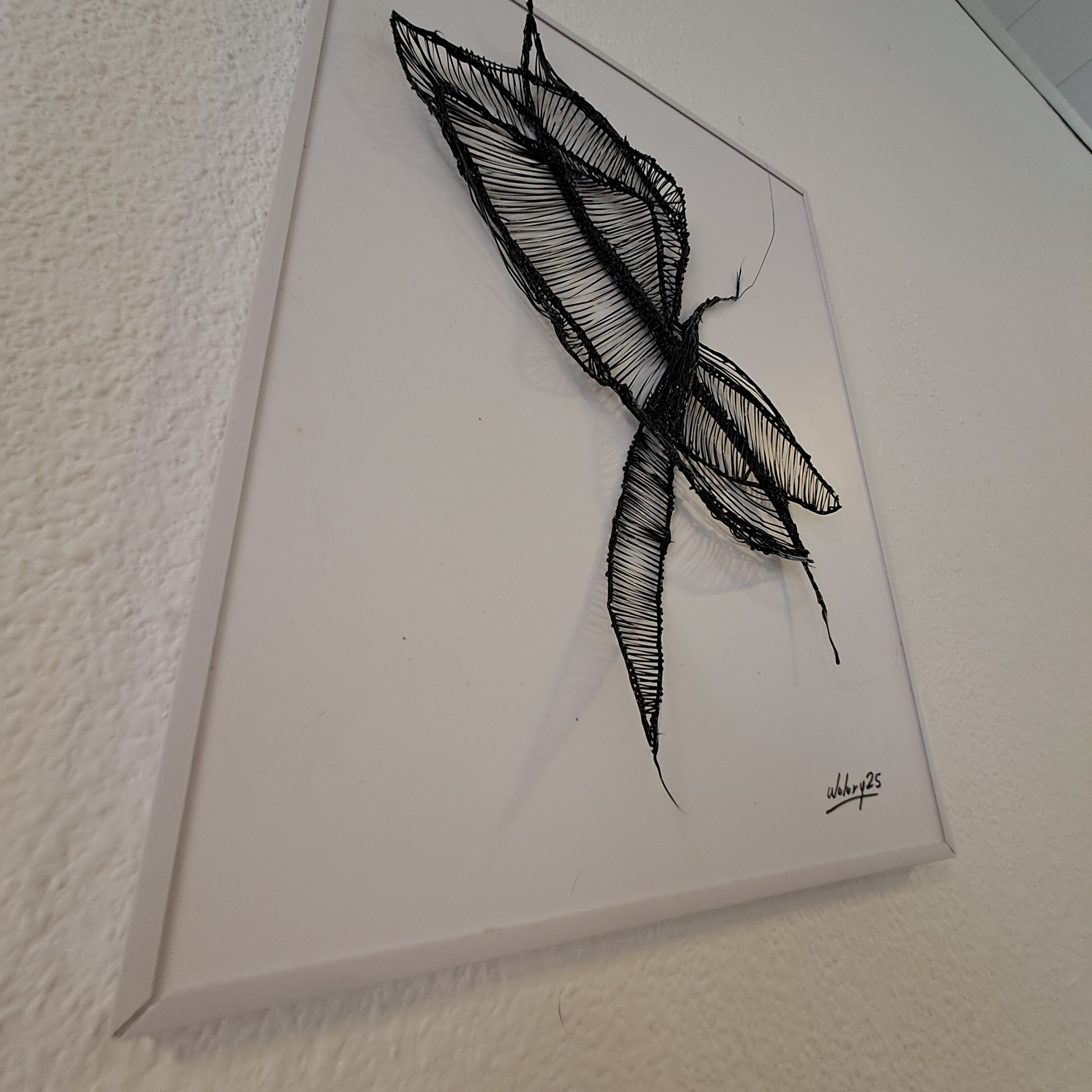 Como el registro frágil de un insecto detenido en el aire, la obra captura lo efímero: alas que ya no baten, pero que aún resuenan en la memoria del vacío. Su trazo se vuelve huella suspendida, eco de un movimiento ausente, donde lo vivo se transforma en sombra y lo orgánico en arquitectura etérea.