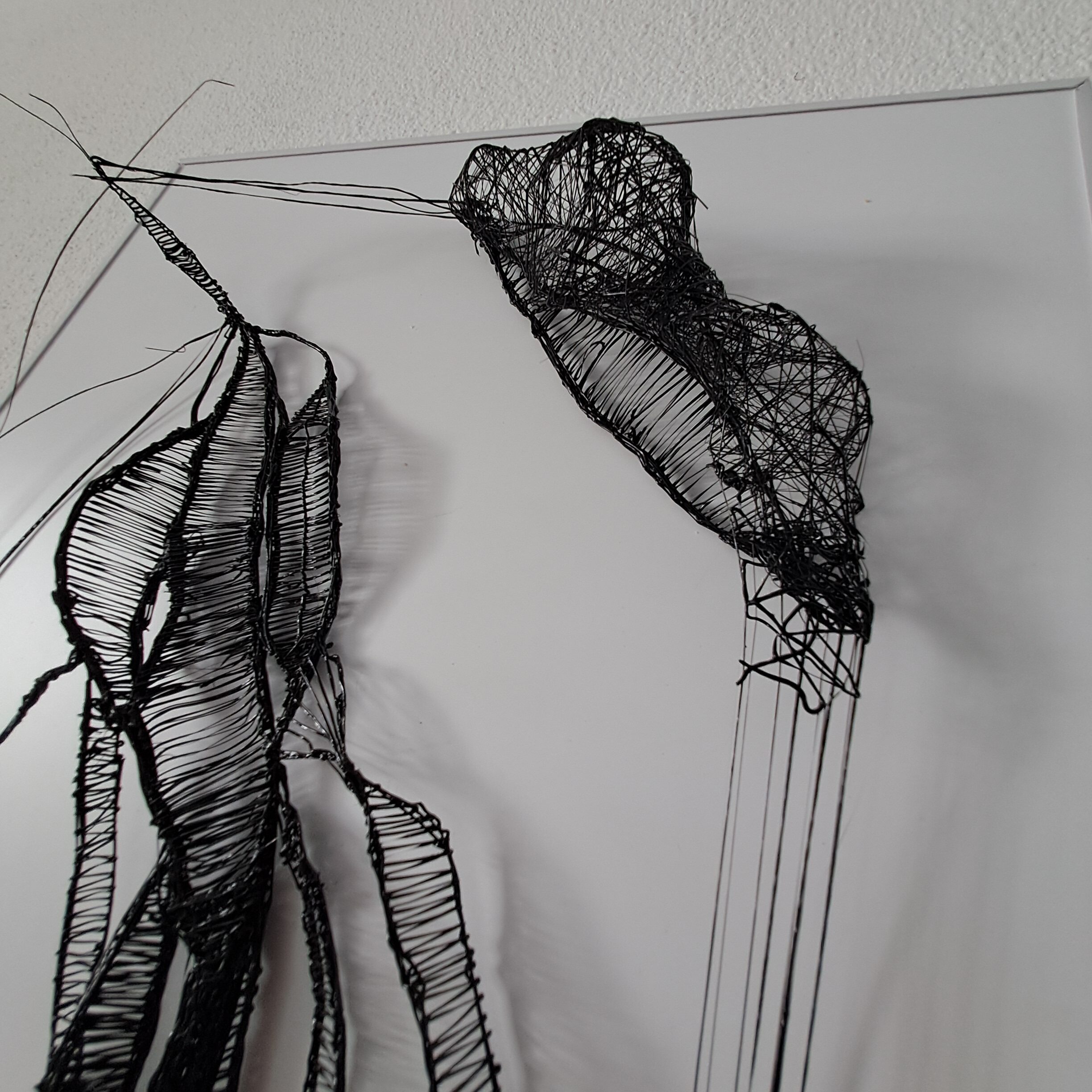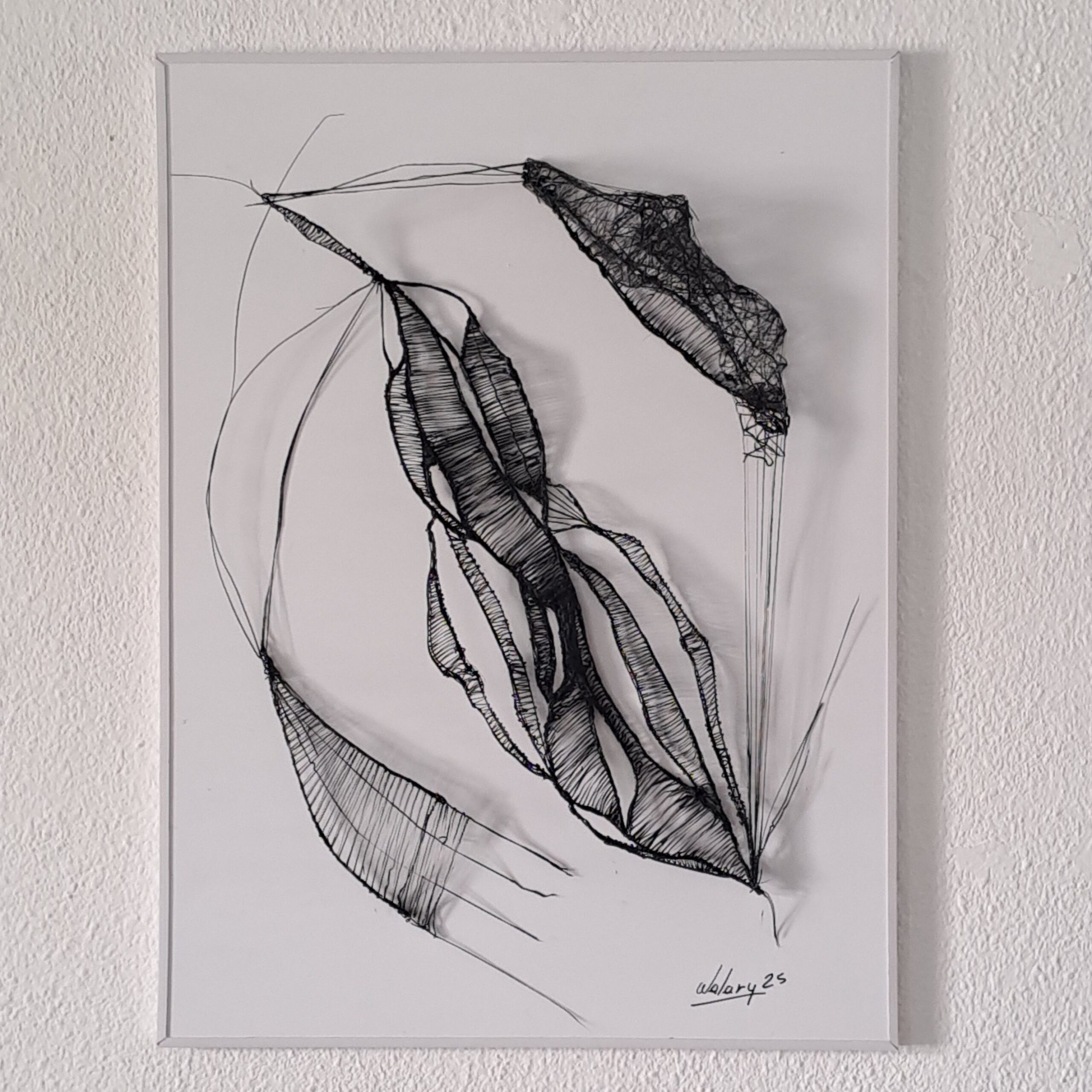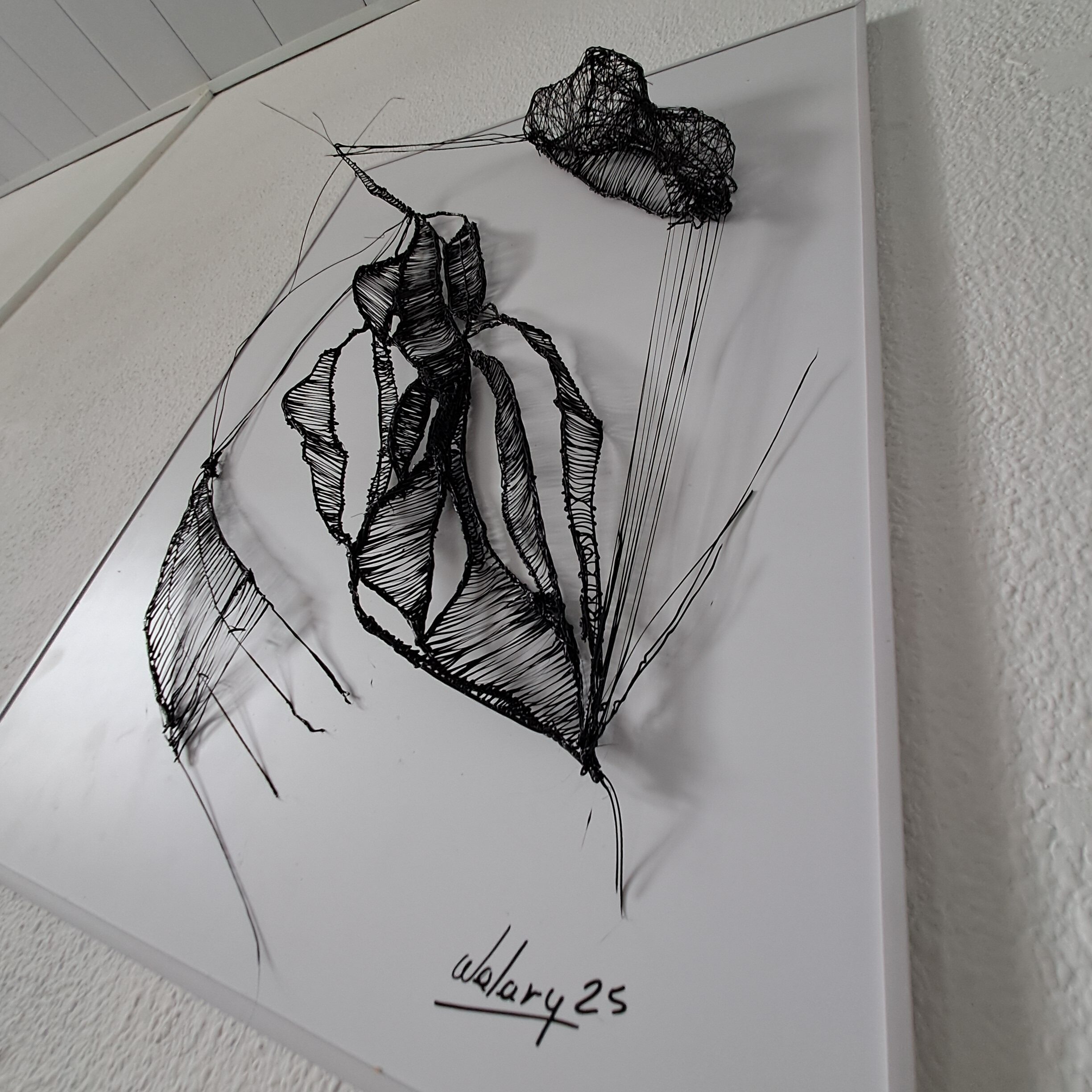 Entre líneas tensadas y transparencias, emerge una silueta que no se fija en un lugar, sino que se desplaza en el límite entre luz y penumbra.